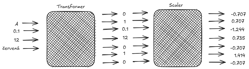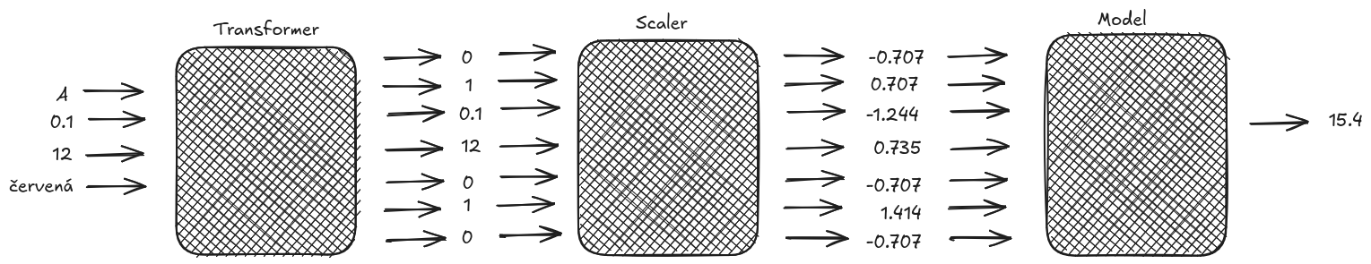 [1., 0., 0., 1., 0.]])Umíme tedy vytvořit krabičku, která transformuje data. Zatím jsme jí dávali vybrané sloupce, nyní si pojďme ukázat, jak několik takových krabiček (každou pro jeden typ vstupů) poskládat dohromady do jedné velké krabičky, která umí transformovat celá data (všechny sloupce).